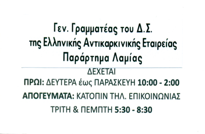 Καθημερινά 10:00 - 14:00 & 17:30 - 20:30 κάθε Τρίτη - Πέμπτη κατόπιν τηλεφώνου.